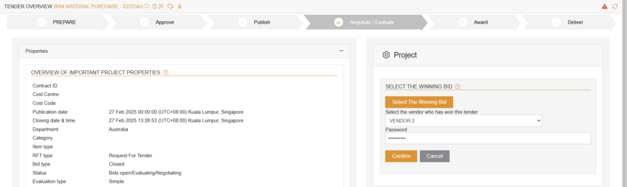 Once the tender has been awarded to Vendor 1, the system will create a copy of the tender, which you will find in the Evaluation/Negotiation list.
